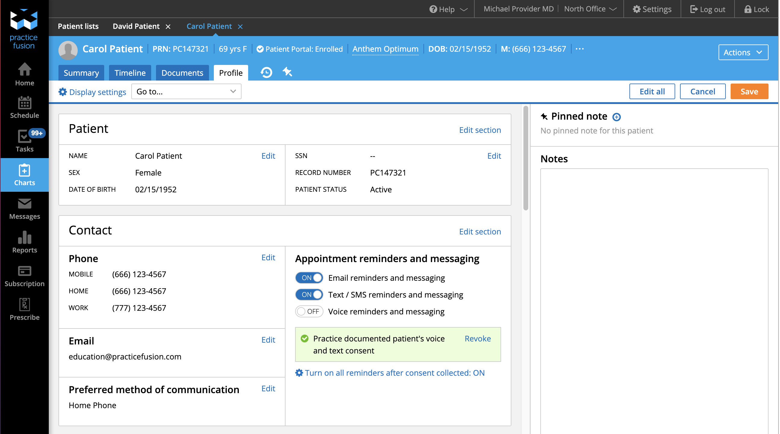 Appointment reminders are included in your Practice Fusion EHR subscription. You can use Practice Fusion’s appointment reminder feature to send patients reminders via email, SMS text messaging, or voice telephone calls.16,17 Appointment reminders are HIPAA compliant and integrate completely with your Practice Fusion EHR.18