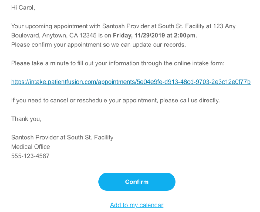 If your administrator has enabled patient intake with the appointment reminder process, email appointment reminders will also contain a link to allow patients to complete Online Check-In.16 Online Check-In enables patients to fill out forms prior to their appointment, at their convenience. This increases staff productivity as well. (Note: At this time, patient intake forms are only available via email appointment reminders.)18