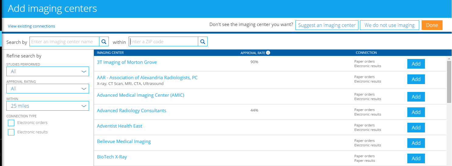- Click Add to request a connection to any of the listed imaging centers. You can connect to a new center using your NPI number or connect your existing imaging center to your EHR with a current imaging account number.
