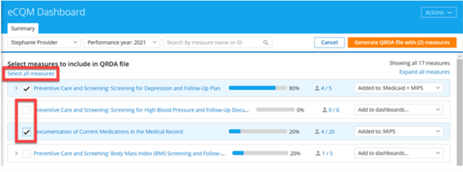 After selecting desired measures, click the orange Generate QRDA file with (X) measures button in the top menu; “X” indicates the total number of measures selected.