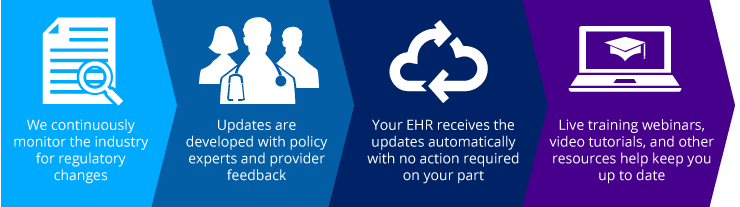 The leading EHR comes with more than just software. We continuously update our Clinical Quality Measures (CQMs) and make sure that you’re automatically kept current with the latest diagnostic, procedural and and billing codes.
