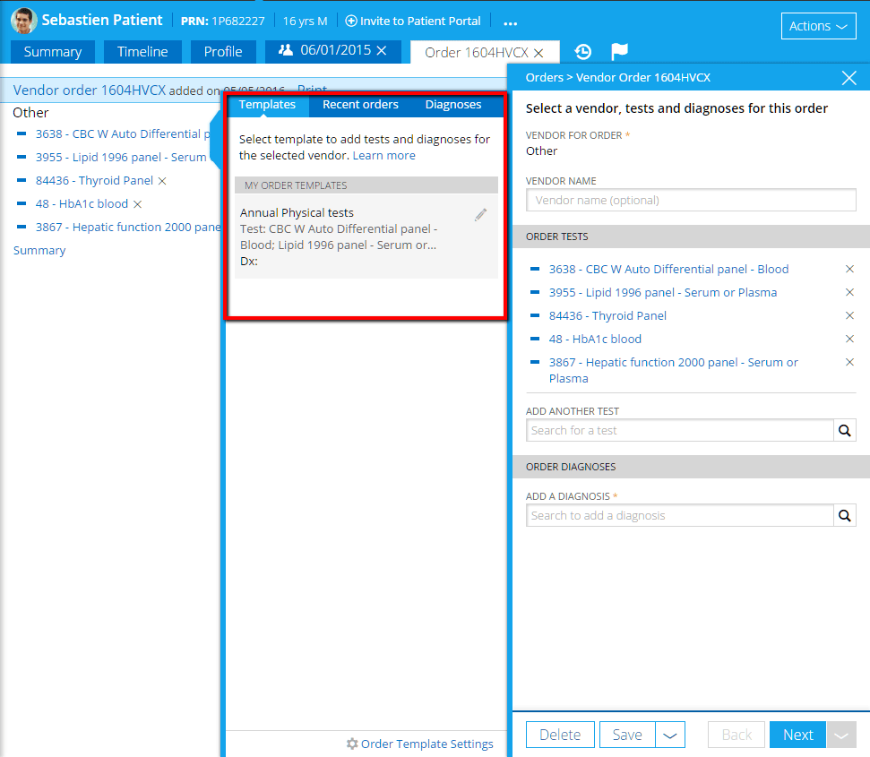 Easily create and save frequently ordered lab panels as templates for easy selection later. Templates allow you to quickly: