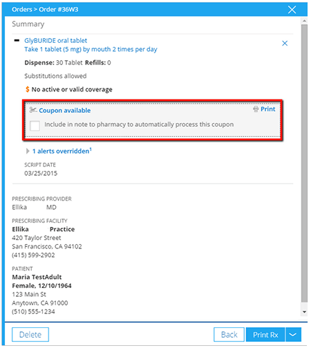 Support patient health and provide easier access to prescribed medications with eCoupons. If any of the medications that you are prescribing for your patient qualify for a coupon, Practice Fusion will provide you with the option to print or send the coupon with your order.