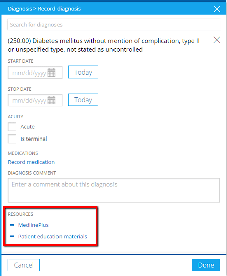 When assigning a diagnosis to a patient, you can select to send patient-centered education materials on their condition.